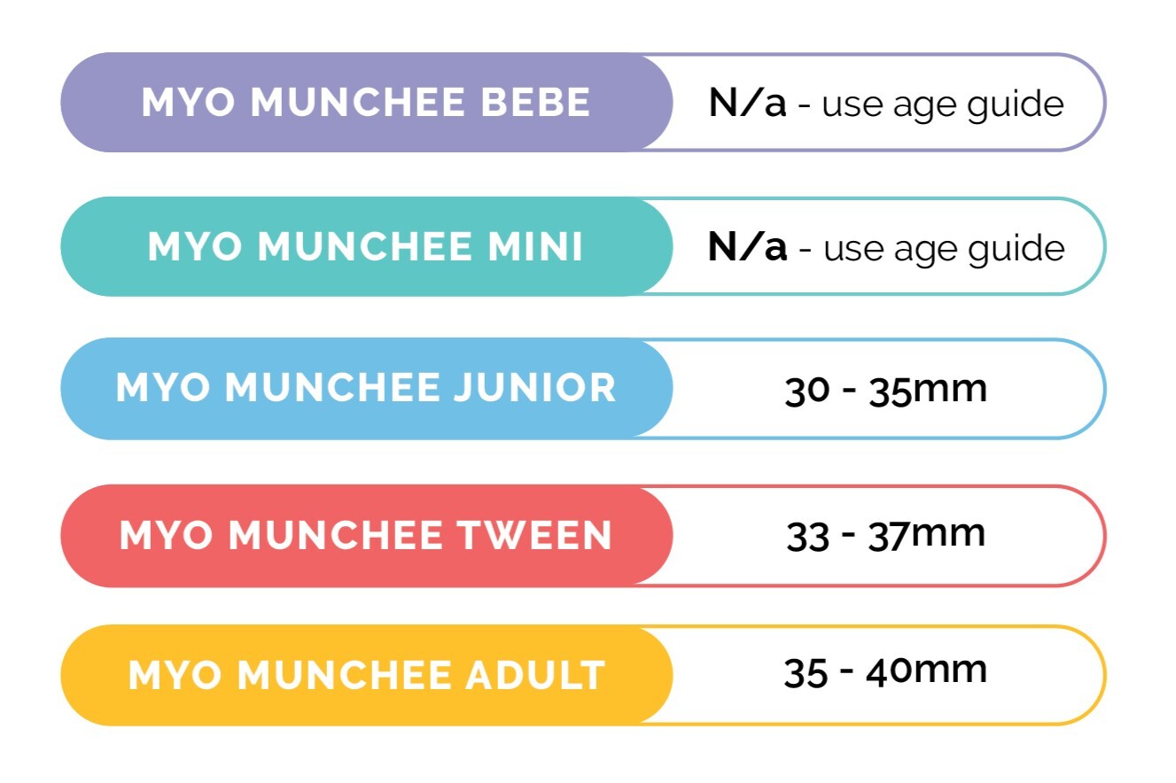 Myo Munchee ADULTFrom 14+ yearsSuitable for most adults and accommodates people from 12 to 14 years of age. Please refer to the Myo Munchee Device Inter-Canine Width Measurement chart below, to confirm suitability for this size. |